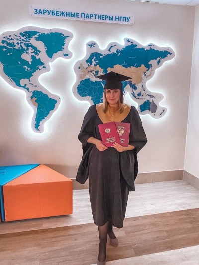 С 2018 по 2021 год обучалась в магистратуре НГПУ ИФМИОЭ по программе подготовки «Педагогика и психология общего и профессионального образования». Окончила обучение дипломом с отличием.